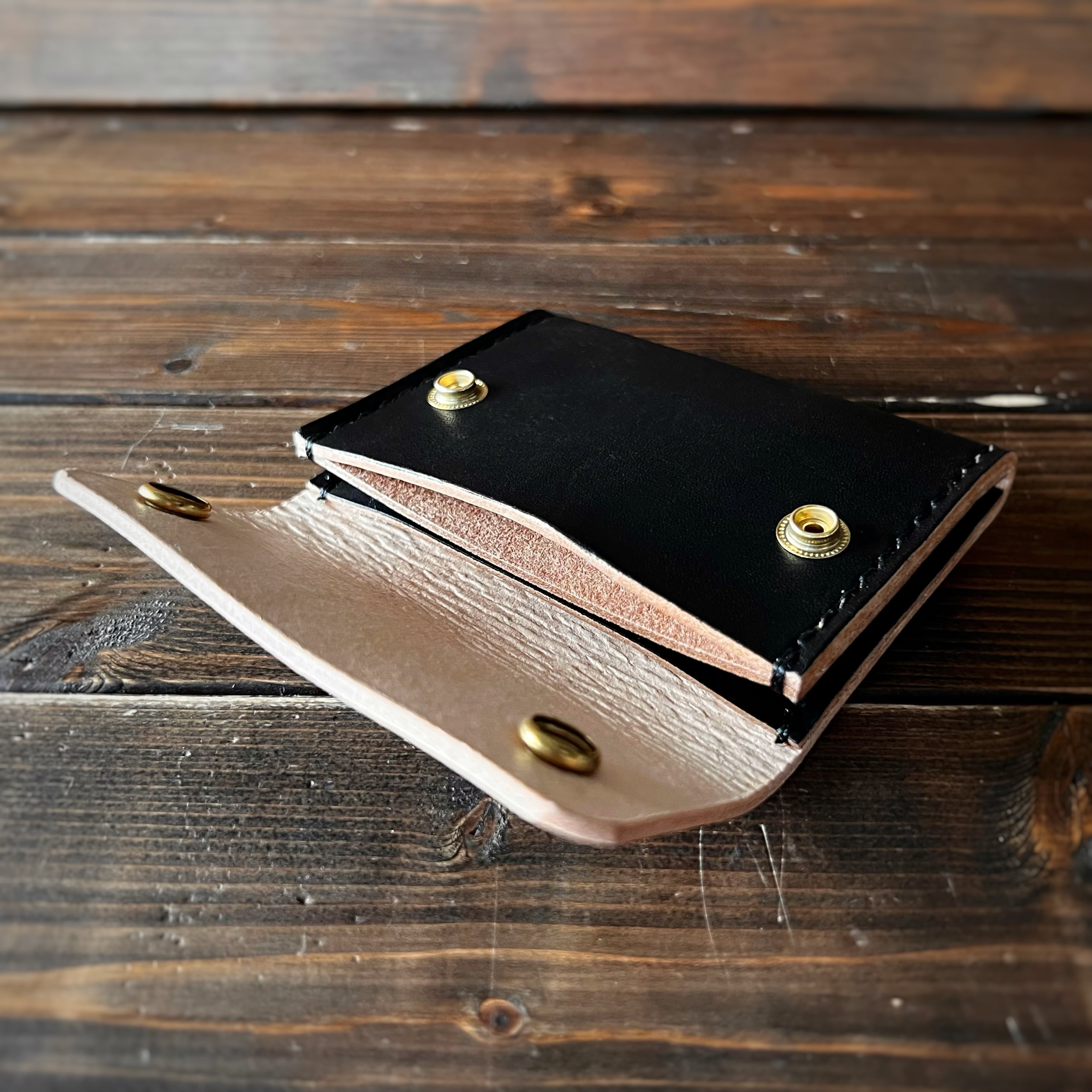 手のひらサイズのコンパクトなコインケース。カードや4つ折りのお札なども入ります。2〜3mmの厚い革を使用しているため、タフで武骨に仕上がっております。